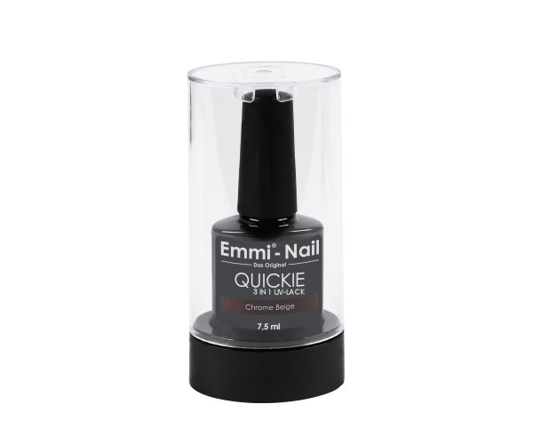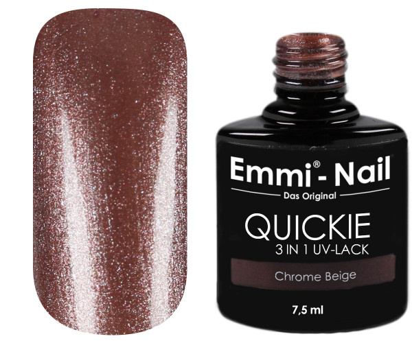 Nový Emmi-Nail Quickie Chrome Beige 3v1 7,5ml sa nanáša rovnako ľahko ako lak na nechty. Dodá nechtom kovový červenohnedý  nádych a ohromujúci lesk. Vytvrdzuje sa pod UV alebo UV/LED svetlom. Odpadá nepríjemný čas sušenia. Ak chcete odstrániť lak 3v1 z prírodných nechtov alebo gélovej modeláže, jednoducho lak odpilujte.